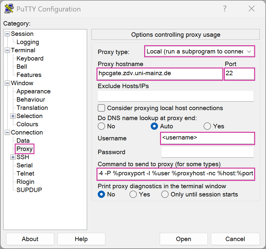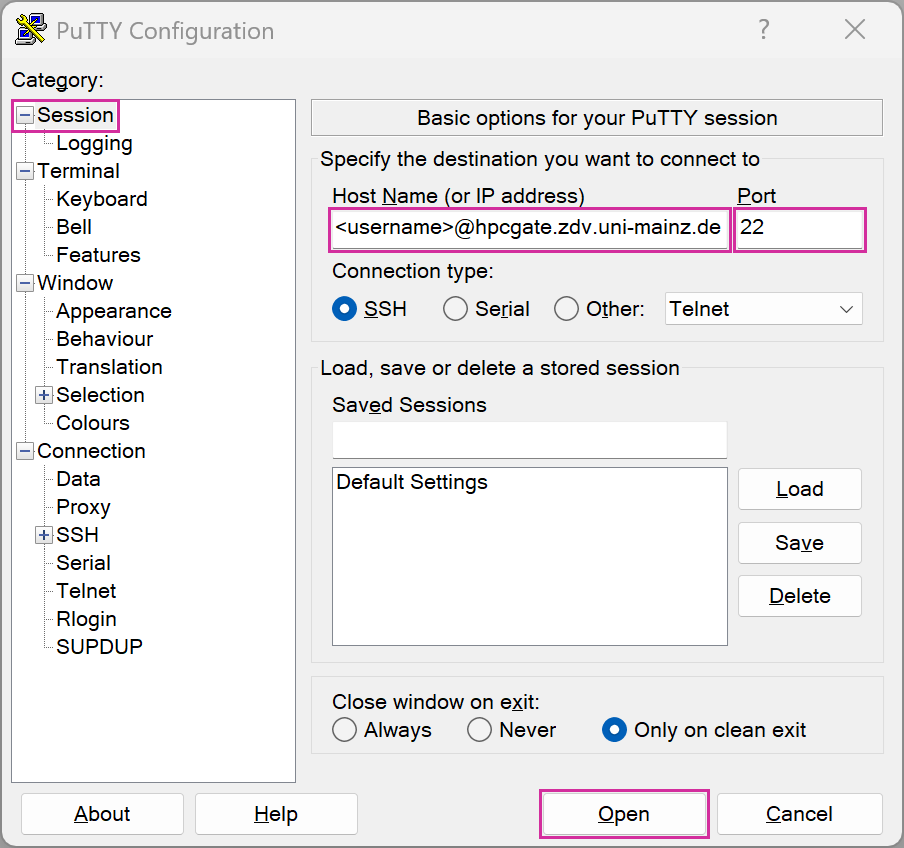 with an editor and add the following lines:Host hpcgate User <username> HostName hpcgate.zdv.uni-mainz.de Port 22 IdentityFile C:/Users/<username>/.ssh/<YourNewPrivateKey> Host mogon HostName miil03.zdv.uni-mainz.de User <username> Port 22 IdentityFile C:/Users/<username>/.ssh/<YourNewPrivateKey> ProxyCommand ssh.exe -W %h:%p -q hpcgate Host mogon-nhr HostName mogon-nhr-01.zdv.uni-mainz.de User <username> Port 22 IdentityFile C:/Users/<username>/.ssh/<YourNewPrivateKey> ProxyCommand ssh.exe -W %h:%p -q hpcgate
