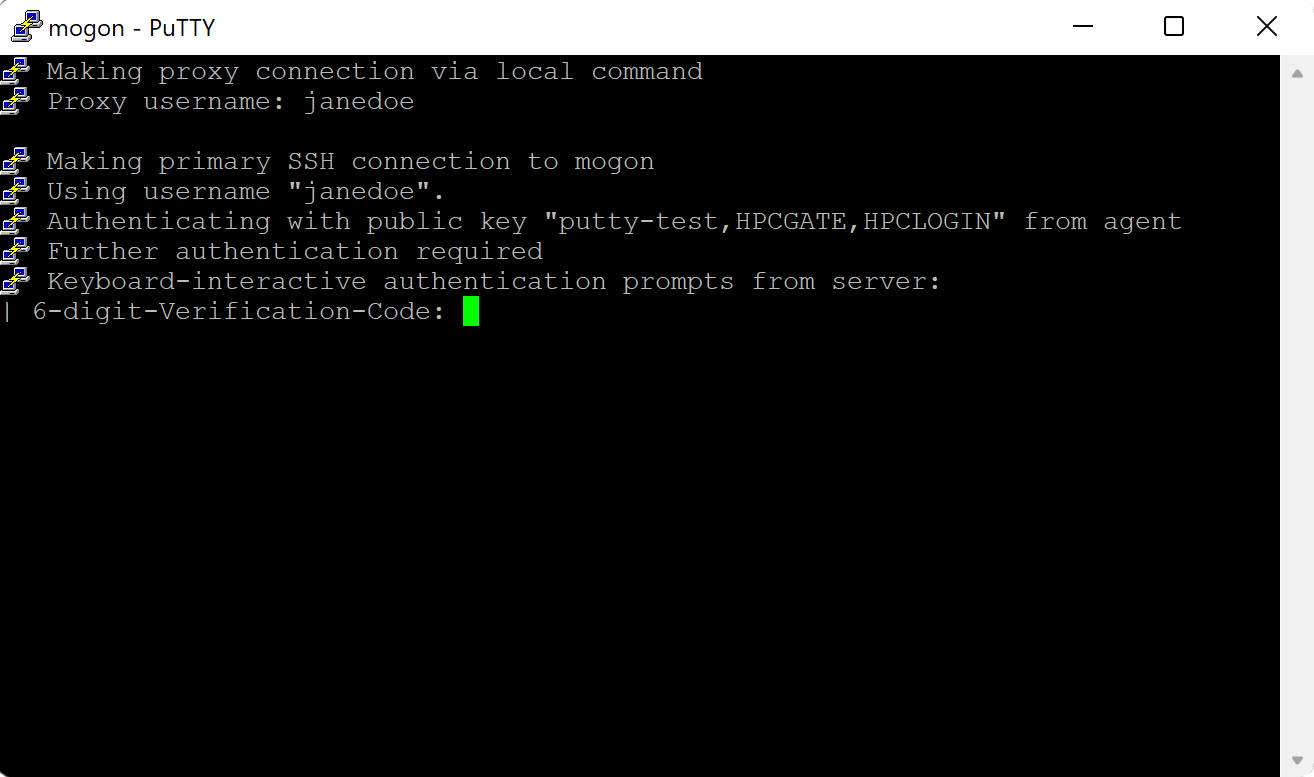 If your SSH setup is correct and enough time has passed for your uploaded public key to be spread throughout our system, a successful connection attempt is going to end with the prompt for your privacyIDEA password (TOTP value